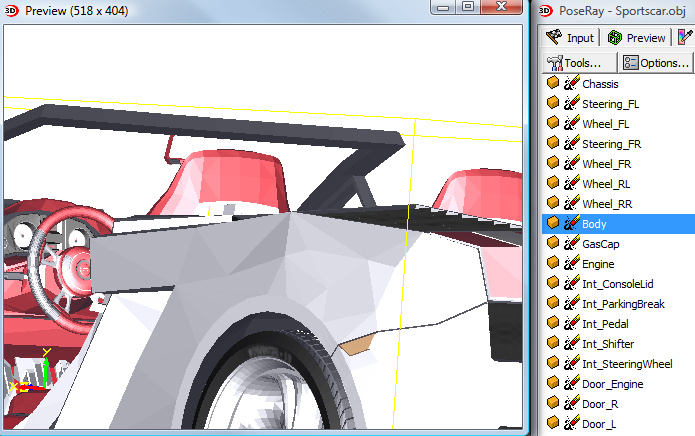 Was ich machen kann ist ols OBJ zu exportieren und in PoseRay importieren. Hier werden mir dann die einzelnen Gruppe angezeigt. Auch gibt es hier eine Smooth-Funktion. Hat da jemand einen Tip, welche Funktion ich hier am besten auswähle?