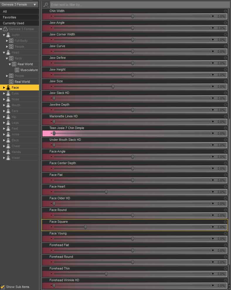 Ehliasys, man kann diese Kategorien aufklappen, z.B. dort wo du in deinem Screenshot "Face" markiert hast, dann kommt man zu den Unterkategorien. Das macht die Sache etwas übersichtlicher.