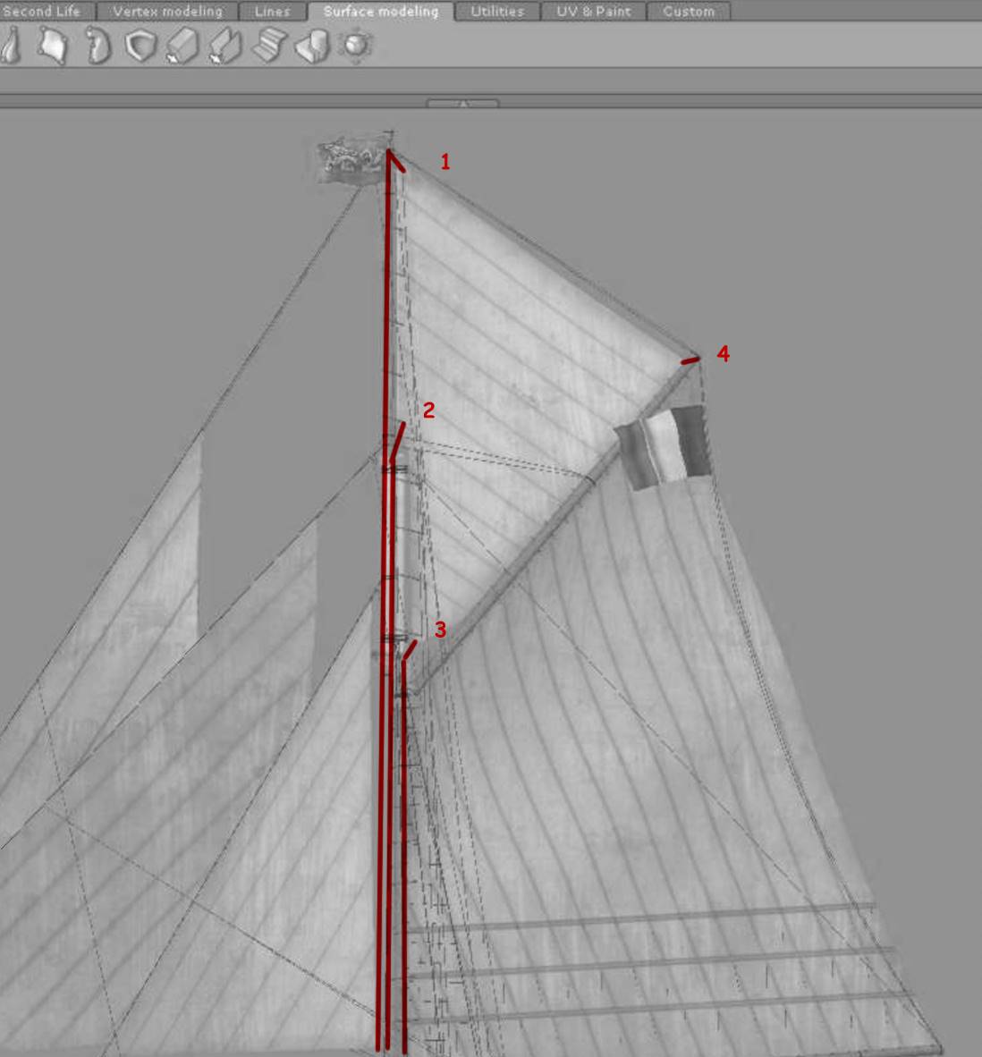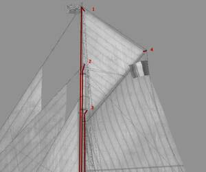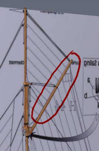 Hm, viel ist an der Stelle auf dem Plan den du gepostet hast, nicht zu erkennen,zumindest aber, daß das Segel keinesfalls am Gaffelbaum festgemacht ist (der Gaffelbaum wird beim Segelsetzen mitsamt dem Segel hochgezogen und beim Segelbergen wieder heruntergelassen ) Wenn also das Topsegel am Mast und am Gaffelbaum festgemacht ist, dann kann das Großsegel nie mehr geborgen werden (und die Manschaft wird dir beim ersten Sturm ganz schön was erzählen