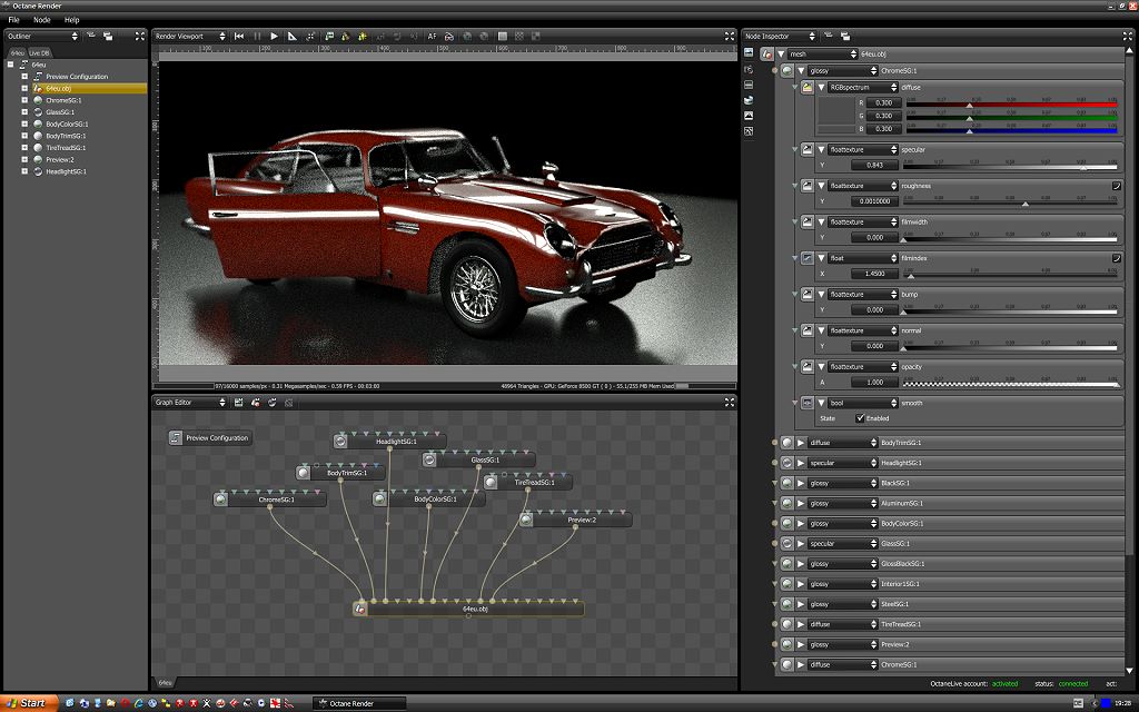 Momentan ist nur das OBJ Format unterstützt, später soll, denke ich, Collada folgen.In Octane setzt man Bilddimension, Kameraeinstellungen und -position, HDRI oder Sonnenlichtbeleuchtung.