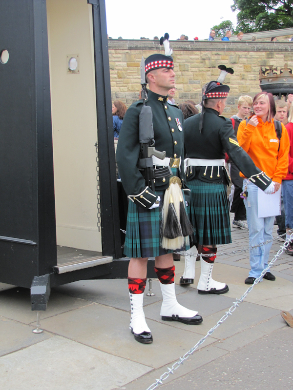 ne das nicht, meine Kamera hat ein feines Tele...lach... und na ja, ich guck mir halt meine Umgebung genau an und es waren schon ein paar recht knackige Kiltträger dabei...grins... hier ist das passende Foto dazu, die Herrschaften sind im übrigen echte Soldaten und haben ihre Kaserne tatsächlich in der Burg Edinburgh. Der Vorgesetzte von dessen rechtem Bein der vorherige Schnappschuss stammt und der uns hier den Rücken zukehrt, hat es im übrigen ausserordentlich genossen, dass er herumlaufen konnte und mit den jungen Touristinnen flirten...