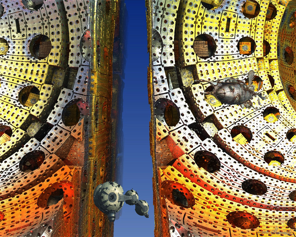 so wie es vielleicht einmal aussieht in der Zukunft...lol...wer weiss... Bild ist zusammengesetzt aus einem Mandelbulb Fraktal, gerenderten Modellen in Vue, die dann als Layer in PSP zusammengesetzt wurden