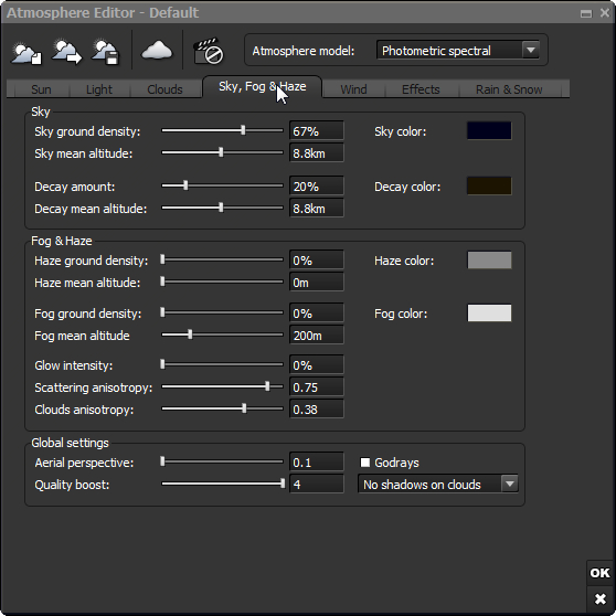 Das lässt sich nicht über die arial perspektive erreichen, sondern über den fog tab und ggf durch Einfügung von tiefliegenden Wolkenschichten oder Metaclouds mit der entsprechenden Farbe, das geht besser