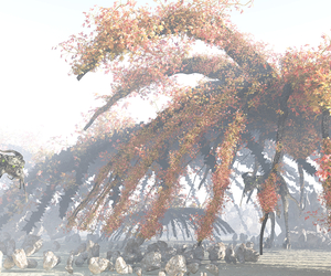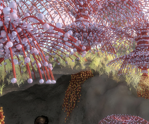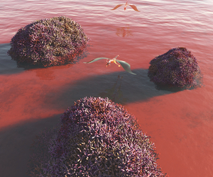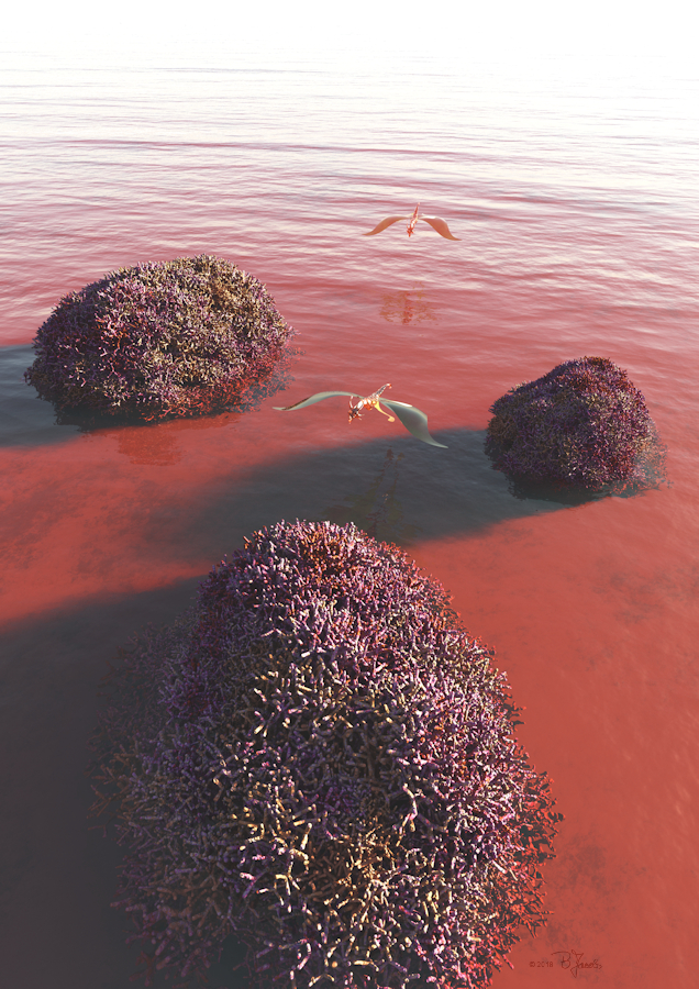 Es gibt eine besondere Landschaftsregion Auf Blue Moon, in der das Meer eine rote Farbe hat aufgrund einer speziellen Mischung von Mineralien. Steine mit gemischtfarbigem Bewuchs liegen verstreut am Strand.