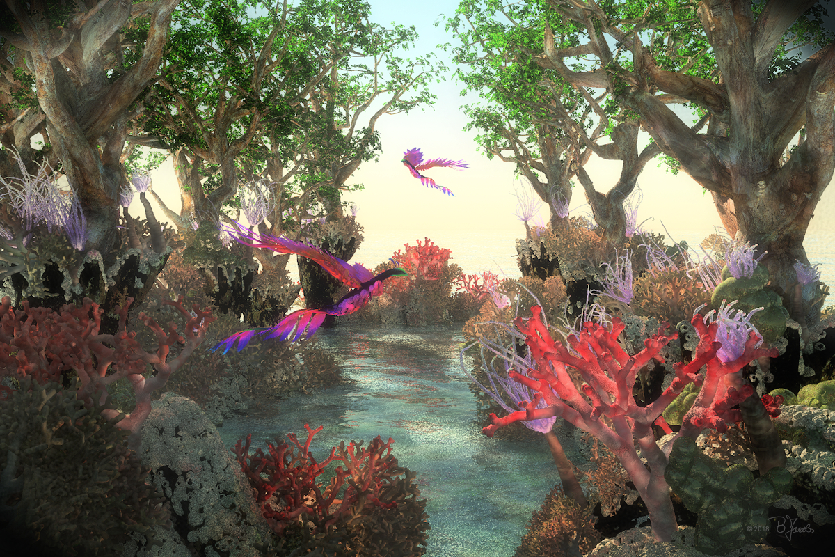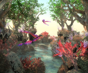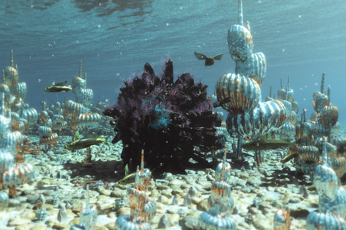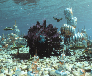 Hier wie versprochen, eine Aufnahme des anderen Meeresgebietes, welches ich gefunden habe. Dort leben die bemerkenswerten Metallballonpflanzen sowie auch das Tentakeltierchen, das sich hier in eine Stachelkorallenskelett eingenistet hat. Die Fliegfische, die sich hier tummeln, müssen wohl importiert sein, den sie gleichen denen auf Terra doch ungemein. -
