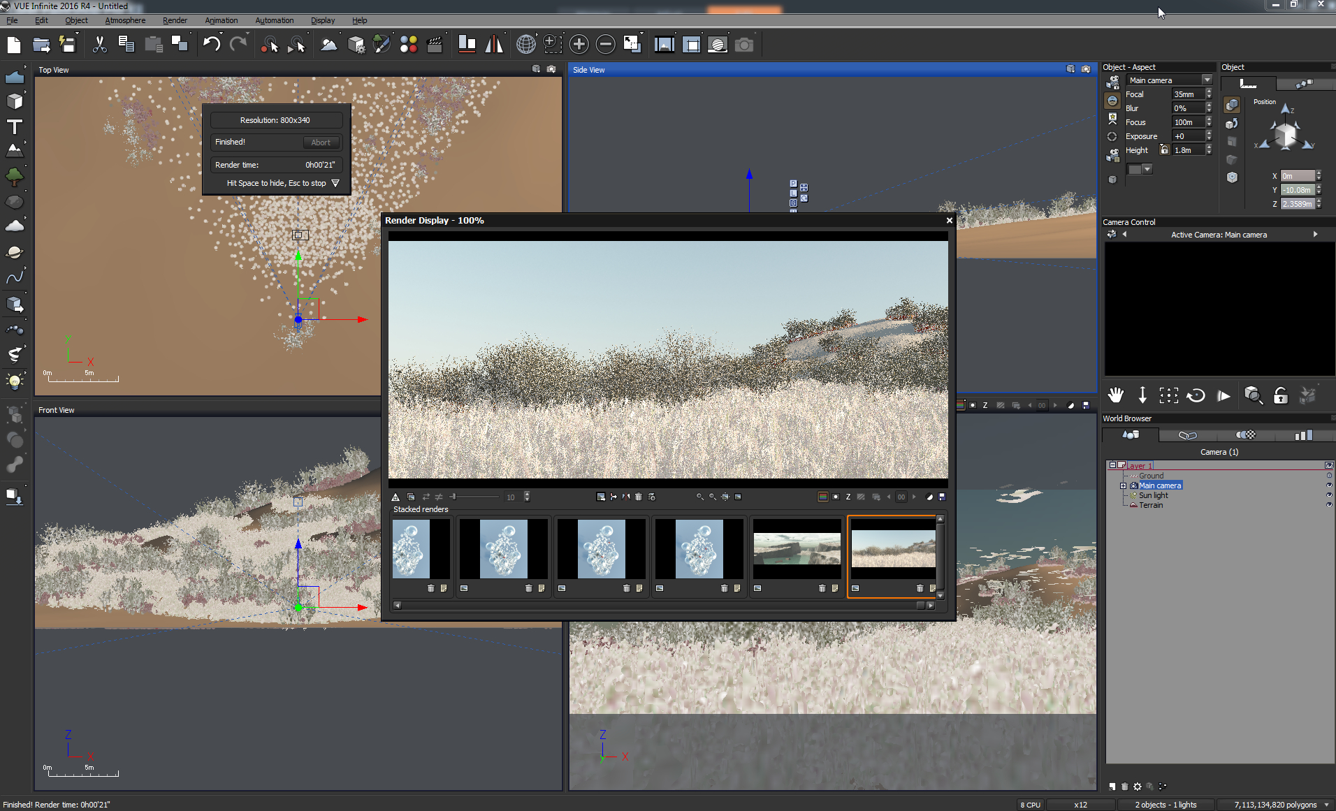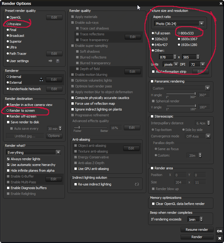 Rendern kannst Du jederzeit auf den Bildschirm in einer Vorschaugrösse, die Dir zusagt. Das geht so: In den Renderoptions die Werte so setzen wie in dem Screenshot unten. Preview anstatt final, wie es von Hause aus kommt, weil sonst die Vorschau zu lange dauert, auf den Screen rendern, weil dann ein Bild der gewünschten Grösse in der MItte des Schirms gerendert wird. Grösseneinstellung rechts vornehmen, kommt mit Zwerggrösse, muss also geändert werden. Sieht dann so aus, wie im zweiten Fenster unten. wenn du dir die vorschaurender speichert kannst du dann in dieser Vorschau auch auf vorhergehende Probeversionen zurückgreifen und vergleichen, was Dir besser gefällt, z.B. bei verschiedenen Atmosheren.