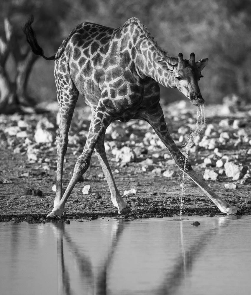 Der Moment - wenn die Giraffe hochschreckt und das Wasser nach dem Trinken aus dem offenen Maul läuft, dauert maximal 2/10 sec. Aufgabe einer Trainingsstunde - 800 Belichtungen - 5 Gute! Zuckt die Giraffe nur, ist der Arbeitsspeicher der Kamera voll und mann kann nicht mehr fotografieren, reagiert mann zu spät - dumm gelaufen. Und bei der Brennweite ist 1/4 000 sec Pflicht. Nicht weil mann selber wackelt, sondern das Tier sich so schnell bewegt. -