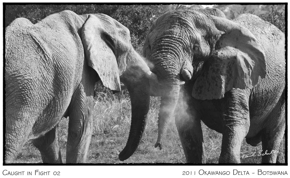 Kämpfende Elefanten im Okawango Delta. Die Erde bebt, Schweiß und Staub in der Luft. Und so ein typischer Macho Geruch - Testosteron?