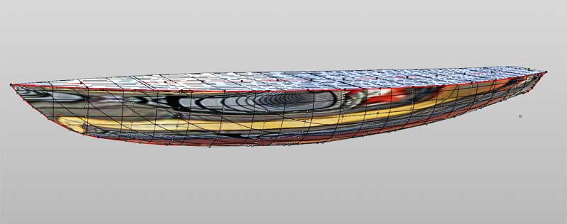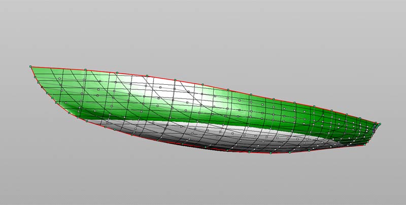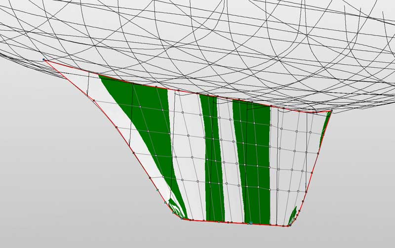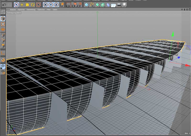 Jetzt hab ich den Fehler gefunden. In Delftship wird nur eine Hälfte konstruiert. Danach per Befehl die andere Seite. Und wenn man nicht genau aufpasst – so wie ich – sind manche Punkte nicht exakt auf der Mittellinie. In der Praxis kein Problem, 5mm Spalte werden zugeschweißt. Aber hier rastet C4d total aus. Beim nächsten mal (?) kuck ich ganz genau hin, jetzt wird einfach nur geflickt.