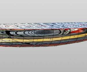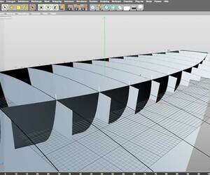 Bei mir also 23,6 m. Ich lade also einen Zylinder 47,36 m Durchmesser und 1 cm hoch, mit 360 Segmenten. Dazu lade ich den Schiffsrumpf, kopiere die Kreissegmente für jeden Spant, baue diese an die entsprechenden Stellen in den Rumpf ohneDeck ein und habe jetzt eine Decksschablone.