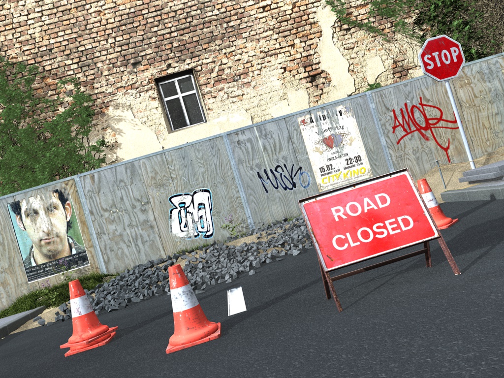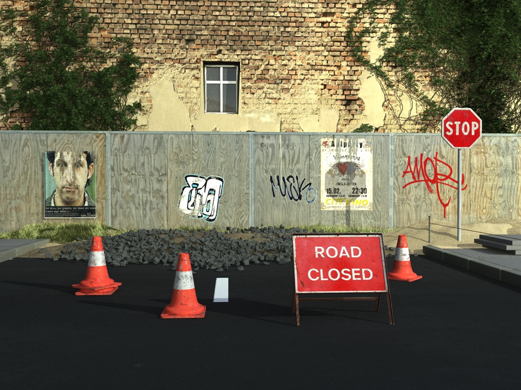 Idee war eine ganz neue Strasse, die einfach auf Grund von Fehlplanungen einfach angefangen wird, obwohl noch ein Haus im Wege steht. Die Bauarbeiter haben sich auch keine Rübe gemacht. Frei nach dem Motto : Not my job !