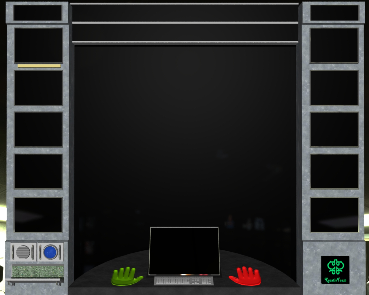 Ich habe ja schon eine "nostalgische" Tastartur auf dem Pult belassen. Die eigendliche Bedienung des Computers geschied in unserer Vorstellung der möglichen Zukunft aber mit den "Handmulden". Die Funktionsweise dieser Mulden soll später nat. auch mal in Wort und Bild erläutert werden, ist aber im Spiel selber nur Deko.