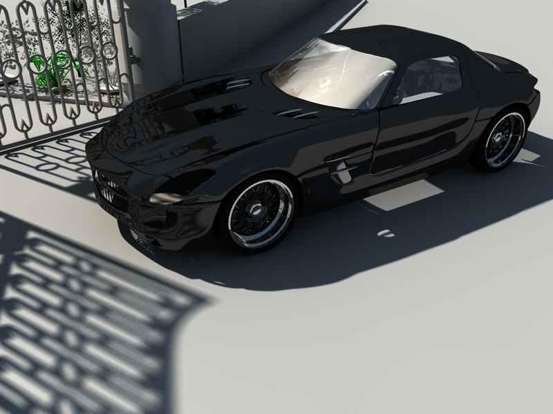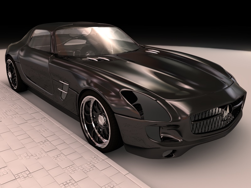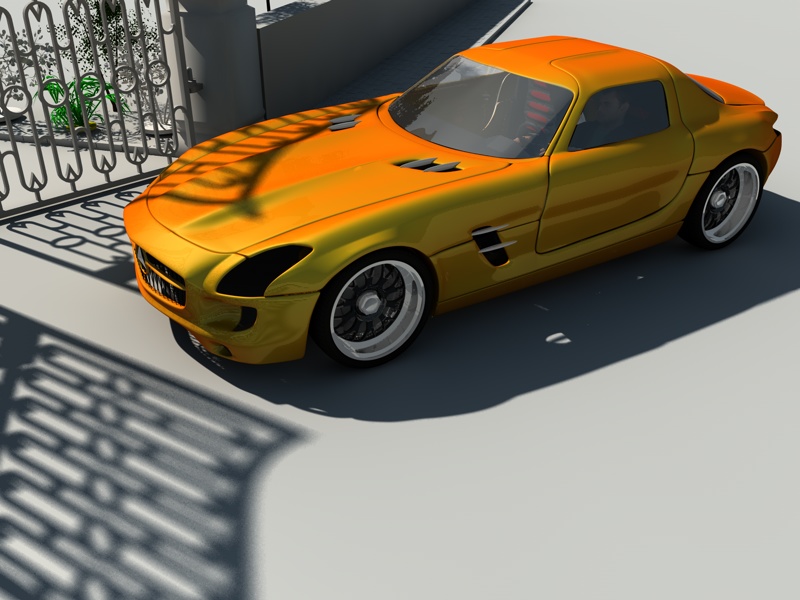 Bis dahin hier noch ein Bild mit erweiteter Szene. Ich habe jetzt ein Himmelsobjekt zur Beleuchtung genutzt.Die Spiegelungen auf dem Lack sind noch etwas dünn da ja auf der "gegenüber liegenden Strassenseite" noch nichts modelliert ist.Ausserdem sind die Glanzlichter auf den Fenster noch zu breit.