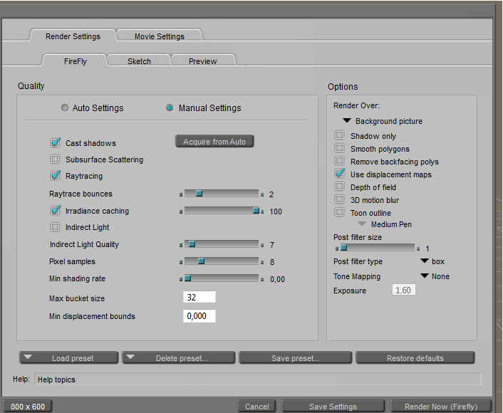 Im Gegensatz zu DAZ.... wo die Figuren auch immer auf Plastic stehen und du eigendlich immer im Surface-Fenster umstellen und Nachjustieren musst musst du Poser sagen was es machen soll... wichtig für die Darstellung beim Rendern ist, das du USE DISPLACEMENT MAPS anharkst, meine Einstellungen sind angehängt, zumindest die für Grobrender.... Wenn du den Wachsschimmer meinst, der bei den neueren Kaufcaras entsteht, dann muss der Harken aus SubSurfaceShadering raus.... oder du nimmst die Poser7 and below -Shader