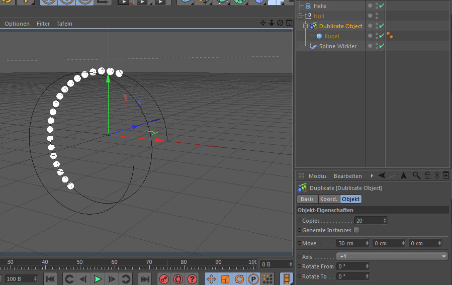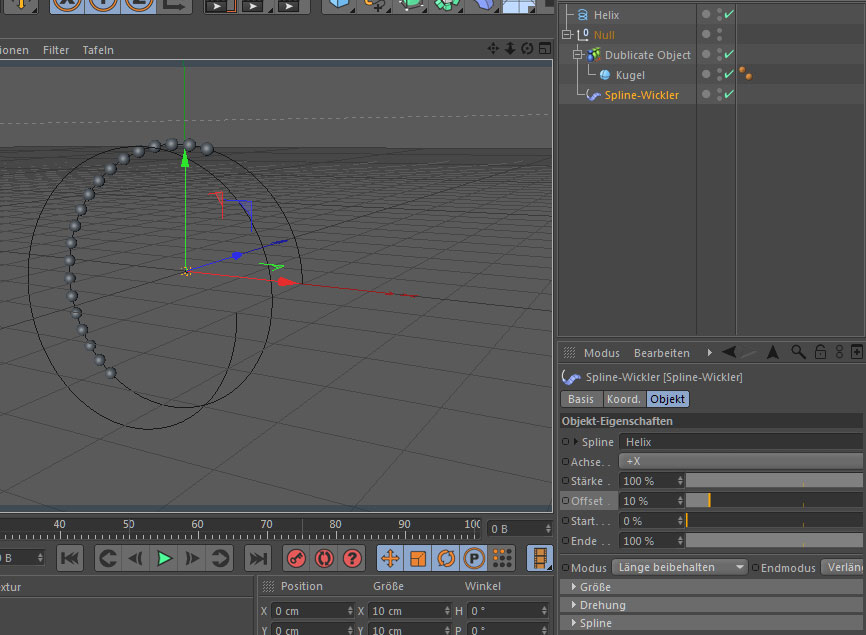 Nun nimmst du ein Nullobjekt und ordnest dem das "Duplicate Object" oder Dein zusammengefasstes Kugelobjekt unter und dann noch den Splinewickler dazu.