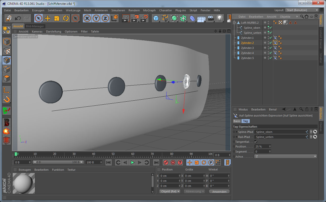 Nun kann man das Fenster kopieren und jeweils in dem Feld 'Position' in dem 'Spline ausrichten Tag' festlegen, an welcher Position des Spline das Bullauge liegen soll.Grüße, Uwe