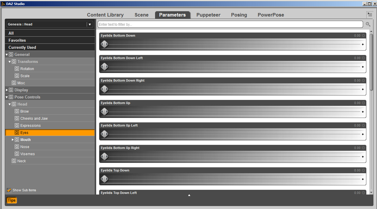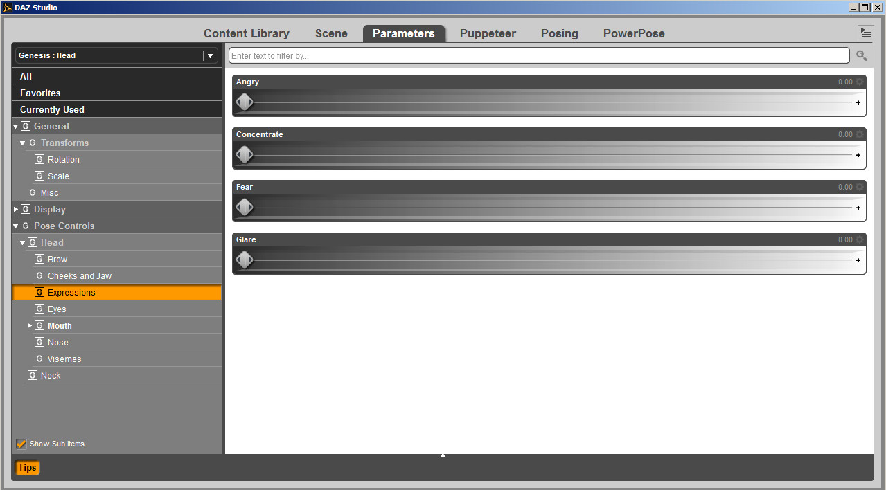 Wenn Du den Kopf der Genesis-Figur ausgewählt hast und dann in den Parameters-Tab gehst (so wie auf dem Anhangbild 01), dann müssten normalerweise unter "Pose Controls" Bereich "Head" "Expressions" ein paar Regler zu sehen sein!