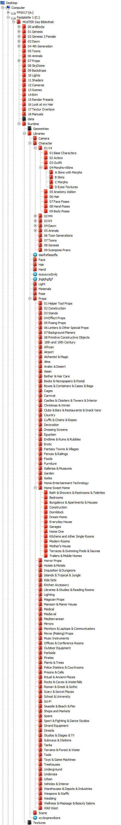 Im Character (Figures) Ordner habe ich dann die Figuren wie "V4", "M4", "K4", "Animals", etc. - Die haben dann wiederum Unterordner wie "Outfit", "Morphs + Skins", "Anatomy Addon", "Hair", "Face Poses", "Body Poses" (siehe Anhangbild "006")