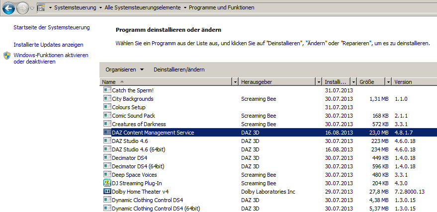 Ich komme doch nochmal zurück zum ContentManagement: Mir ist klar, dass Du da schon viele Sachen durchgespielt hast. Aber ganz konkret: Hast Du (wie unten auf dem Anhangbild zu sehen ist) über die Systemsteuerung den "DAZ ContentManagementService" deinstalliert!? Nicht über andere Wege, sondern so. Und danach NICHT neu installiert, sondern gleich versucht das DAZ Studio zu starten!?