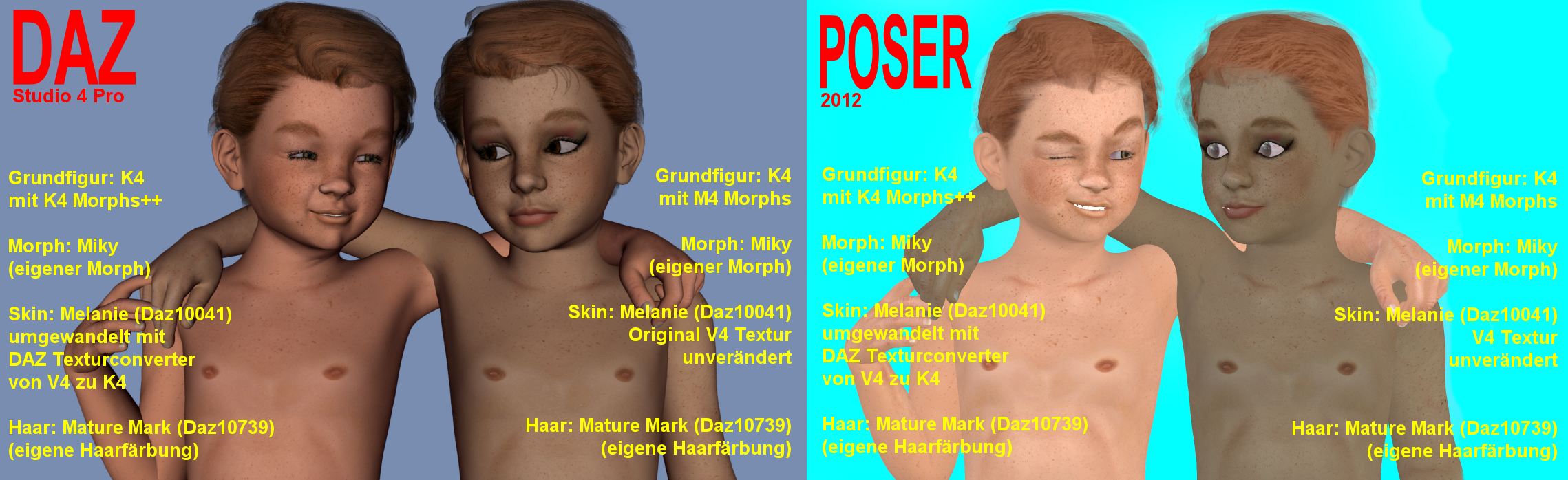 Bei der einen Figur (jeweils links) handelt es sich um eine reine K4 Figur, mit dem Morphs++ Paket. Die andere Figur (rechts) ist eine K4 Figur, welche das M4 Morphs++ Paket bekommen hat. Auf beide Figuren habe ich jeweils dann den GLEICHEN (von mir vorher als pz2 erstellten Morph) angewendet.