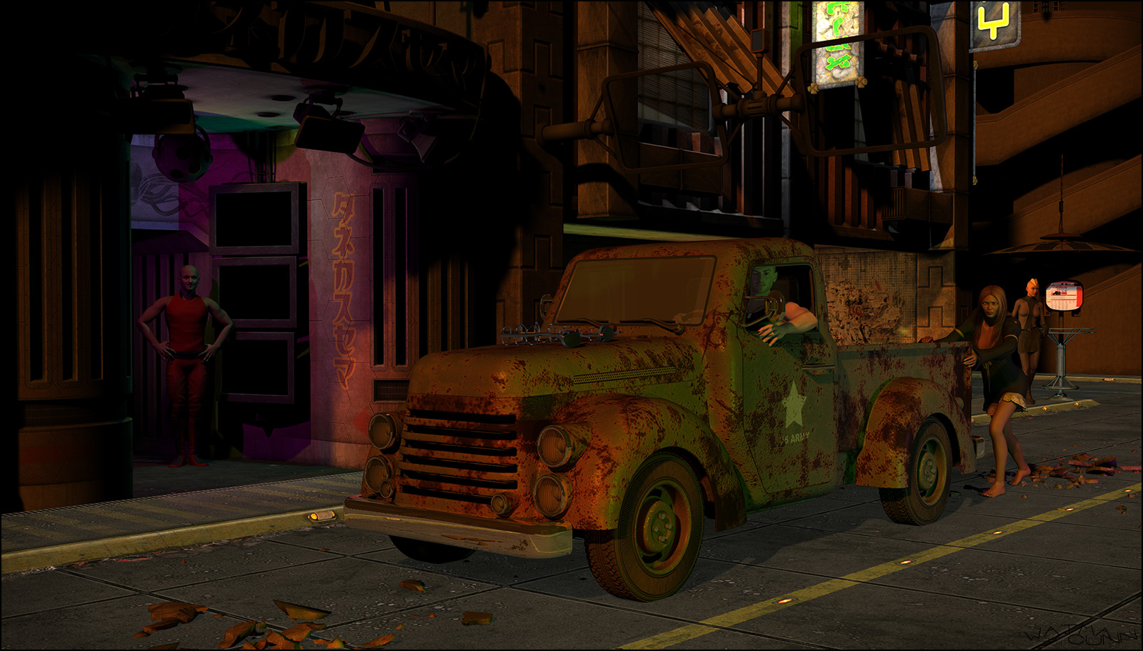 In der Szene sind schon etliche Lichter (Linear Point Lights) verteilt um die Straßenbeleuchtung nachzustellen, wegen der Reklame, dem Licht aus den Fenstern (da war im Ursprung nichts und ich hab schon experimentiert damit es einigermaßen so wirkt als ob von innen Licht kommt) - ist sicher nochmal einen Versuch wert diese Lichter so weit zu verstärken das sie alleine die Szene beleuchten und ggfs. wirklich noch Spotlights gezielt einsetzen.HerrenSocke: