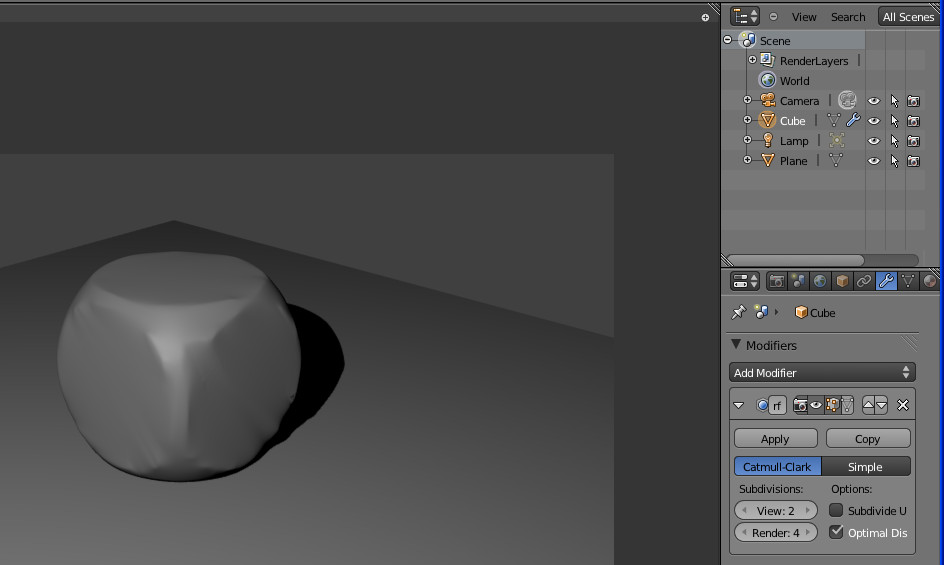 Wenn ich dann unter Modifiers "Subdivision Surface" angebe und entsprechend einstelle, wie es in Deiner Szene der Fall ist, erhalte ich einen deformierten Würfel nach dem Rendern. (siehe Bild 2)