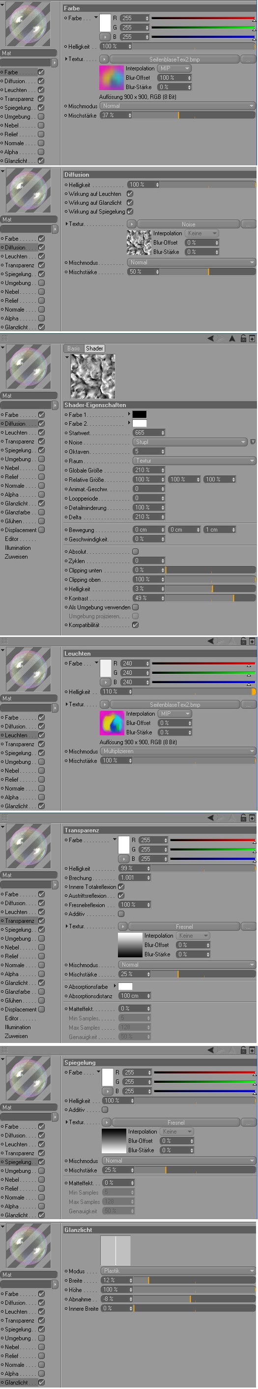 Allerdings ist auch dieses Material sehr instabil. Sobald sich Rendereinstellungen, Hintergrund oder Lichtquellen ändern, ist es nichts mehr mit der Seifenblase.