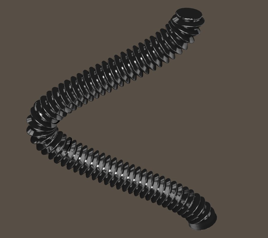 Also erstelle in Hex mit Zylinder und Biegen also mit einer Kurfe einen flexiblen Schlauch.Das geht relativ einfach, Problem habe ich um die Realistische Wellenform hinzubekommen in die Oberfläche.