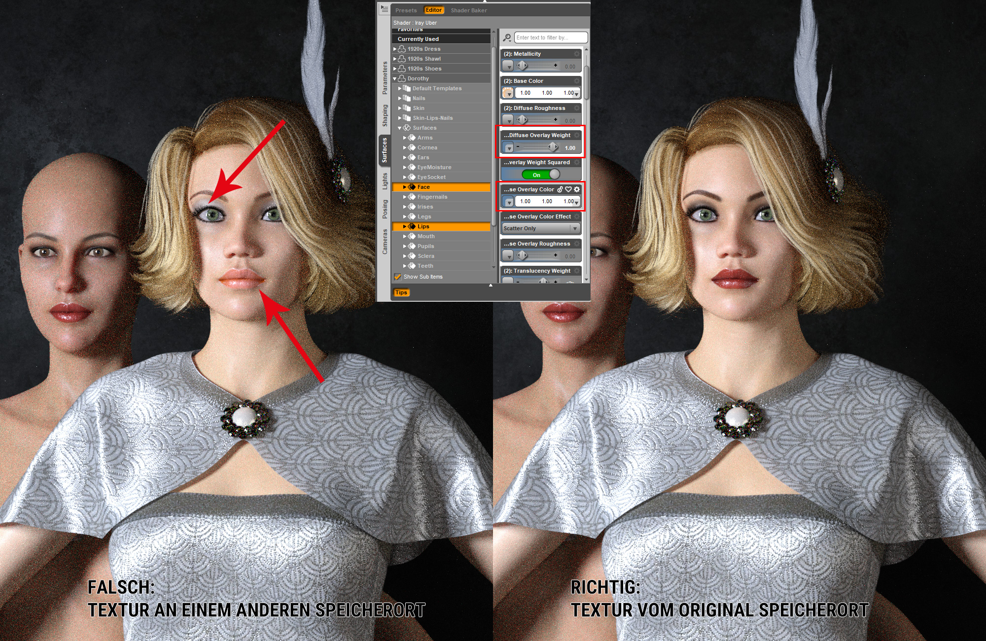 Darauf hin habe ich ein wenig rumexperimentiert und siehe da, jedes mal wenn ich die Overlay-Schminktexturen an einem anderen Speicherort habe, komme ich zu dem falschen Renderergebnis.
