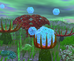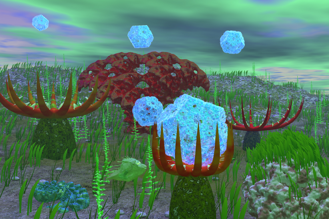 Die Seegraswiesen etwas weiter vor der Küste sind ein reichhaltiger Lebensraum. Aufwellende Strömungen liefern nährstoffreiches Tiefenwasser, welches in der sonnendurchschienenen Zone Wachstum von Plankton erlaubt. Dodecahedra incendica lässt sich von der Strömung treiben und filtert das Plankton durch ihre vielfältigen Poren heraus. Diese urtümlichen Vertreter der Incendizoa verfügen über kein Nervensystem und können sich nur begrenzt selbst bewegen. Kommen sie dem Boden zu nahe, so sind sie ein leichtes Opfer für den Selachophyton. Dieser fest sitzende Räuber muss mit jeder Beute vorlieb nehmen, die er mit seinen zahnbewehrten Fangarmen zu fassen bekommt. Ein Incendaspis wartet auf die Reste des Mahls. Im Hintergrund eine solitäre Incendidendron-Koralle.