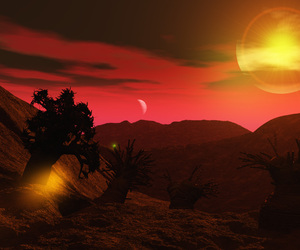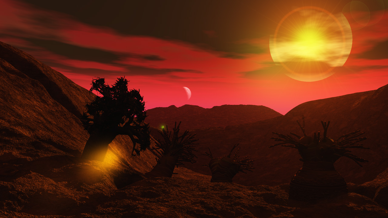 Der Planet, auf den sich das Ausgangsszenario bezieht, ist eine sogenannte "Super-Erde". Er ist ca. 4-5 mal so schwer wie die Erde, von ähnlicher Dichte und deswegen mit einer festen Oberfläche. Er umkreist eine kleine rote Sonne. Die Temperaturen sollen im für Leben erträglichen Bereich liegen: