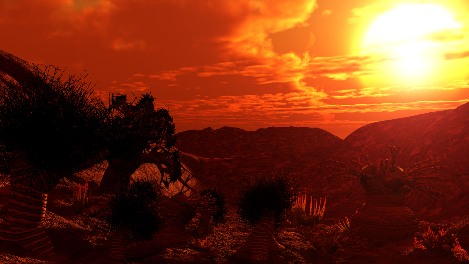 Zum momentanen Stand: Den Lens flare Effekt direkt auf der Sonne find ich irritierend. Ich meine den großen gelben runden Fleck, der Rest des Lens flares passt schon. Die Pflanzen hören sich interessant an, aber man sieht nicht viel davon.....eigentlich schade. Ein ganz klein wenig Licht aus Richtung der Kamera würde vielleicht etwas mehr von der Pflanzenstruktur zeigen. Oder die allgemeine Beleuchtung (Ambiente) einen Tacken verstärken.