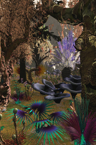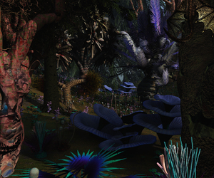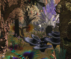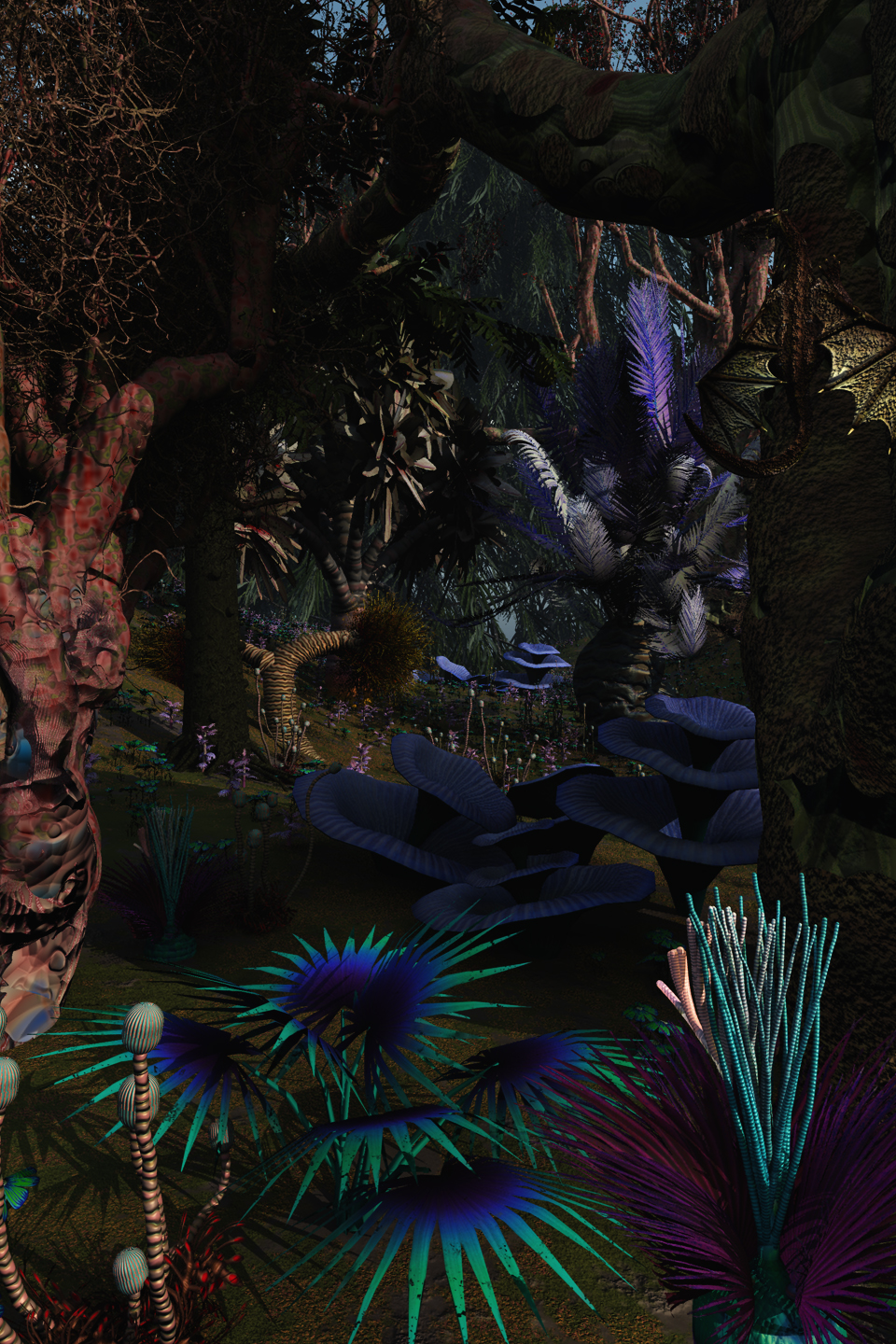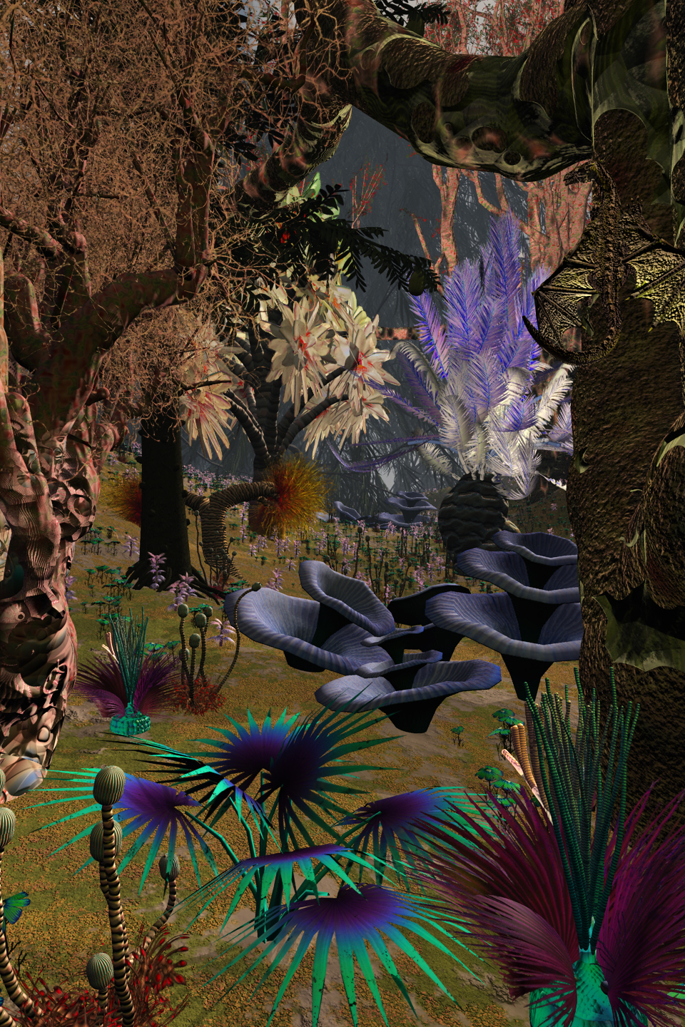 Bei Geekatplay.com gibt es mehrere schöne Lerneinheiten zur Landschaftsgestaltung in Vue, alle unter dem Titel "Epic Landscapes". Gleich die erste Lerneinheit der ersten Serie hatte die Erstellung eines Waldwegs zum Thema. Ich fand das Video faszinierend. Man bekommt den Umgang mit dem Geländeeditor beigebracht und wie man mit relativ wenigen, dafür aber sorgfältig ausgewählten Baummodellen den Eindruck eines Weges im Wald erzeugt. Ich wollte diese Einheit mit anderen Modellen nachbauen, um so etwas wie einen Weg oder Pfad in einem außerirdischen Wald zu gestalten. Das unten stehende Bild kam dabei heraus.