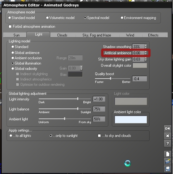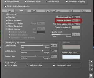 Hier sind die beiden Einstellungen, die für den ersten Render aktiv waren.Unter "Licht" habe ich die beiden Schieber markiert, die ich für das zweite Bild verändert habe. Ich hatte sie dort beide auf 100% gesetzt ("Light Balance" auf "100% Sunlight" und "Ambient Light" auf "100% from Sky").
