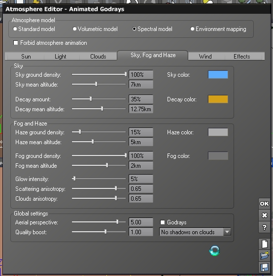 Kushankus Tipp mit dem Umgebungslicht war schon mal gut. Bei Vue scheint sich dies hinter mindestens 2 Reglern im Atmosphäreneditor zu verbergen. Ich habe hier die beiden für mich erkennbaren Schieber auf "Null Umgebungslicht" gesetzt und die Szene ansonsten mit denselben Atmosphäreneinstellungen erneut gerendert. Es zeigen sich zwar immer noch keine richtigen Schatten, aber das Bild sieht schon einmal etwas anders aus. Als nächstes werde ich einige andere Atmosphären testen.