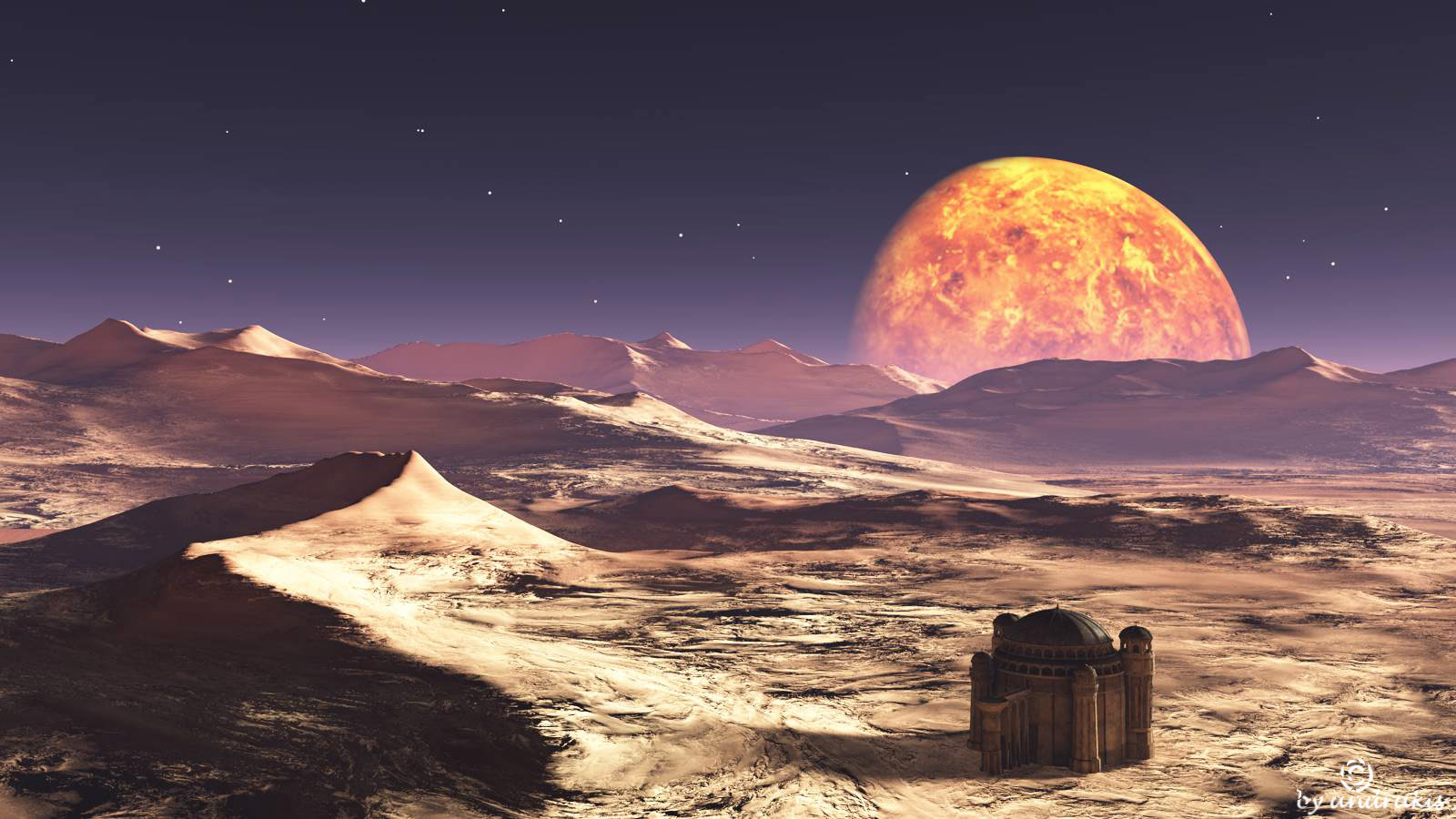 So, und wieder ein Vue Render nach einem Tut. Hier ging es diesmal um das Erstellen einer weitläufigen Landschaft, das Texturieren derselben und einer Sci-Fi Atmosphäre. Das mit den Planeten ist wirklich interessant und auch der Material-Editor ist mir nun nicht mehr ganz so fremd.