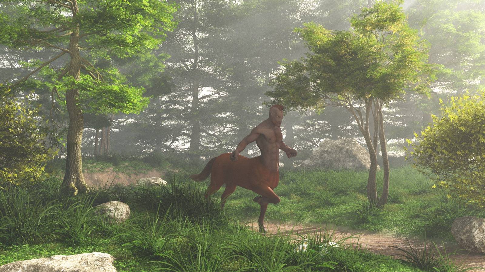2. Das erste Bild mit den Einstellungen bei Fog und Haze aus dem Geekatplay Tutorial. Ja, ich habe es gesehen, der Zentaur schwebte in diesem Bild noch. Drop Objects hat hier irgendwie nicht richtig funktioniert. Möglicherweise weil der Baum daneben so dicht dran ist.