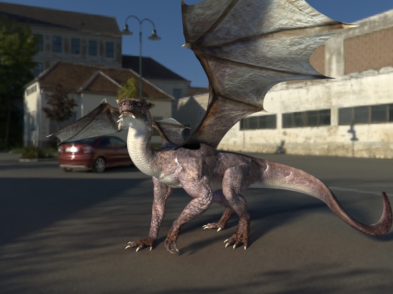 Für C4d Besitzer ist das"reinrendern"(Hintergrundcomposing)gar nicht so tragisch.Ich hab den Drachen mal mit Vray in eine HDRI Map reingerendert.Funzt aber auch in jedes 2d Bild oder getrackte Kamera.