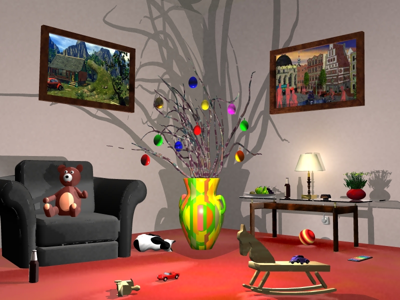 Was mir auffällt ist, daß die Ränder, z.B. bei dem Dreieck, nicht ganz glatt zu sein scheinen. Ich hatte das auch schon und mußte dann unter "Qualität" das Antialiasing auf "Superfein" stellen. Dann wird allerdings viel länger gerendert, dafür hat man dann ein scharfes Bild.