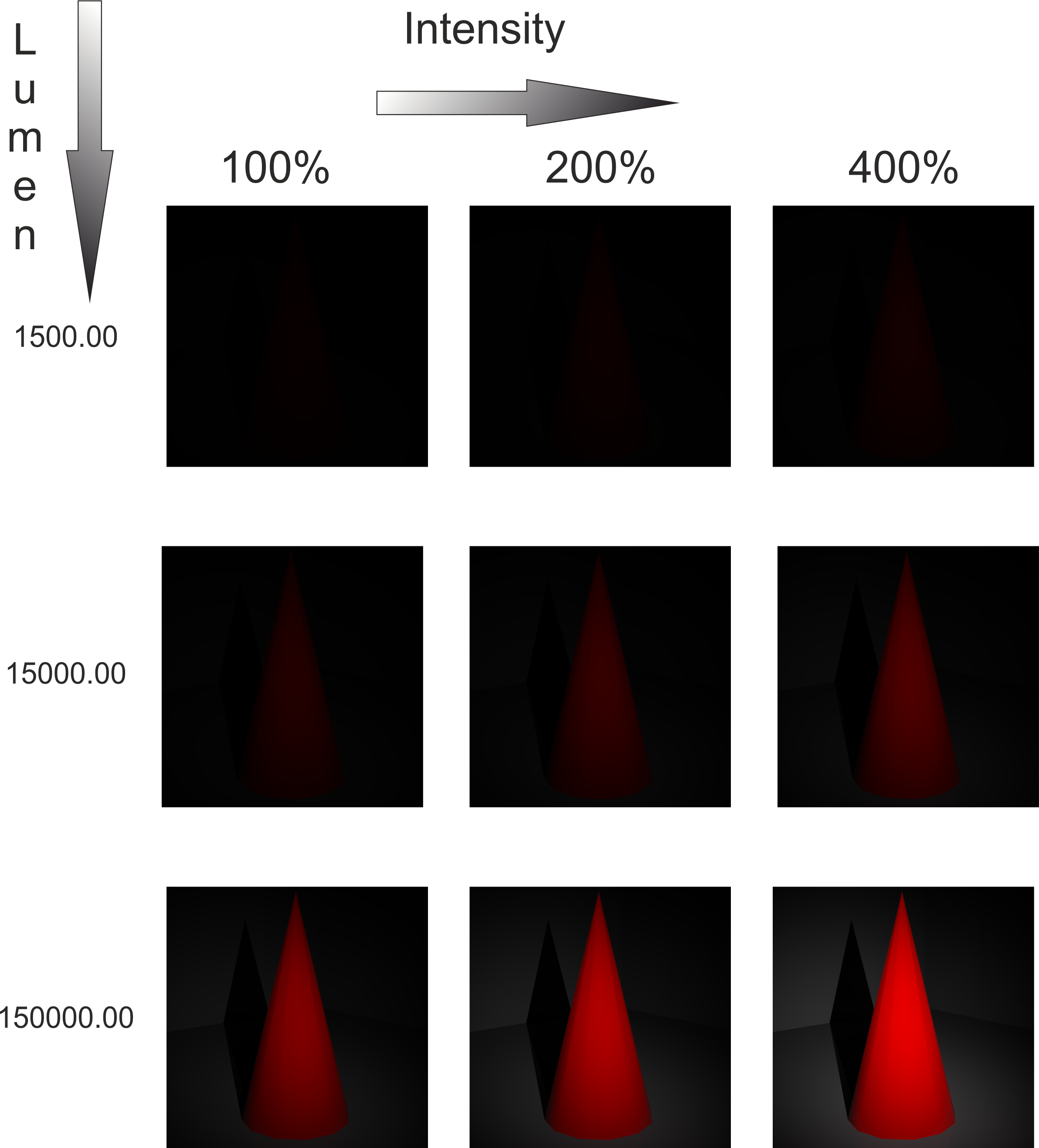 Das Spotlight hatte die folgenden Werte: Farbe: weiß; Intensity: 100%, 200% und 400%; Lumen: 1500.00, 15000.00, und 150000.00; Temeratur(K): 6500.00.